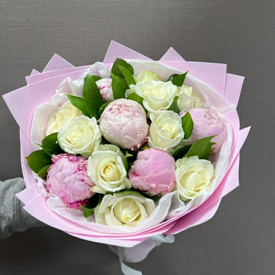 На фото букет «трепетное чувство». В составе: пион 5 шт, роза 9 шт, фоамиран 1 шт, атласная лента 1 шт, . Все цветы свежие и ароматные, букет красиво оформлен и отлично подходит для подарка. Доступна доставка цветов или самовывоз.